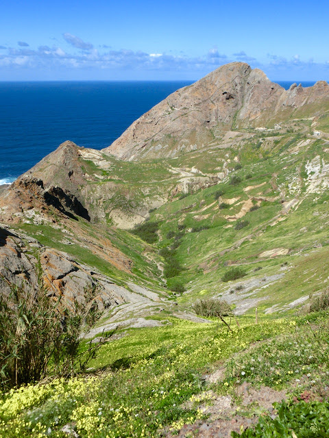 Mit der Umrundung des benachbarten Pico do Facho durchqueren wir das Zentrum der Insel und begegnen den Überresten der alten Ackerflächen und der in harter Arbeit errichteten doppelten Mauern. Die Wiederaufforstungsbemühungen haben zwar Früchte getragen, doch die extremen Bedingungen von Wind und Sonne machen es den Bäumen schwer.