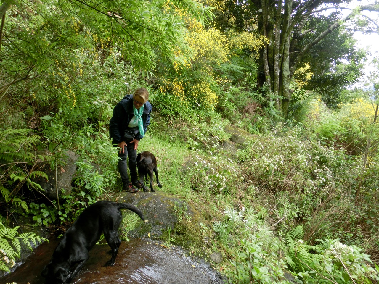 Der gestufte Abstieg zum Bach ist noch gut zu erkennen, der Aufstieg auf der anderen Seite schon weniger und dann ist für uns der Umkehrpunkt erreicht. Die Hunde erkunden noch ein paar Meter im Dickicht, doch der schmale Pfad, der hoch zum Caminho Real (PR 12) führt, muss erstmal wieder freigehackt werden.