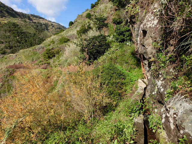 Wir treffen uns mit Regina um eine Levadarunde im Tabuatal zu unternehmen. Hier gibt es zwei sehr alte, landwirtschaftlich genutzte Levadas um die Terrassenfelder zu beiden Seiten des Tals zu bewässern. Die Wasserkanäle sind zum Teil noch gemauert, flach und schmal - die begleitenden Arbeitswege auch.